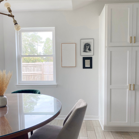 Although a tiny grouping of only three frames, the color variety has a large impact on the space by tying together the surrounding hardware and furniture.