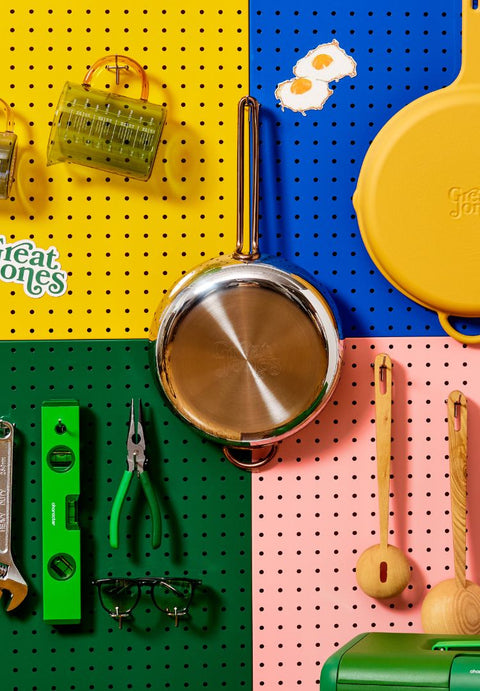 The Pegboard Set, designed together by Great Jones and Character, is ideal for keeping cookware within easy reach, mounting tools in a closet or garage, and customizing the space-saving storage solution of your dreams.