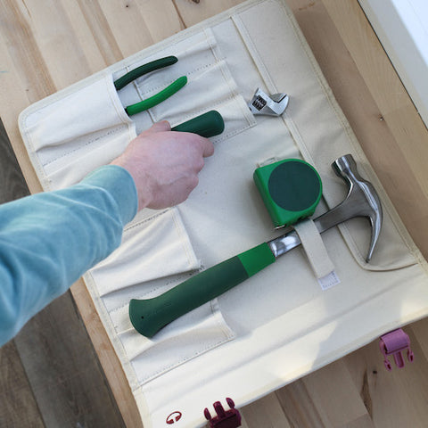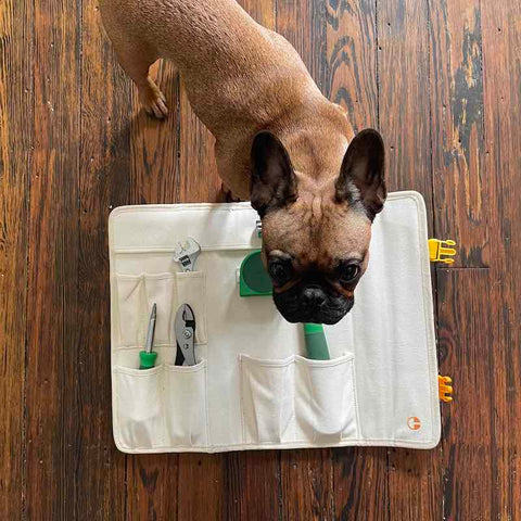 The Tool Tote, made of natural canvas, securely holds your go-to tools (with room to grow) in its organized but flexible internal pockets and quickly clips to close so you can carry it wherever you go.